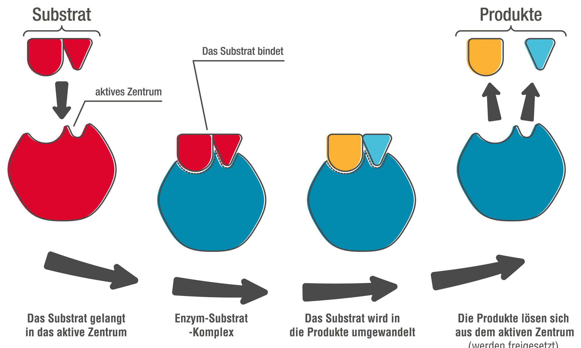 Enzyme interagieren mit ihren Substraten nach einem Schlüssel-Schloss-Prinzip. Damit ein Substrat in ein Reaktionsprodukt umgewandelt werden kann, muss es zunächst in einen reaktionsfähigen Übergangszustand überführt werden. Dazu ist eine bestimmte Aktivierungsenergie erforderlich. Die spezifische Bindung zwischen Enzym und Substrat wird auch als Enzym-Substrat-Komplex bezeichnet und führt zu einer Verringerung dieser Aktivierungsenergie. Das Substrat wird dabei im aktiven Zentrum, oft eine Vertiefung oder Einstülpung der Enzymoberfläche, gebunden. Diese Verbindung führt zu einem neuen Reaktionsweg, der eine niedrigere Aktivierungsenergie aufweist als der Weg der nicht-katalysierten Reaktion ohne Enzym. Durch die Interaktion von Enzymen mit ihren Substraten wird also eine höhere Reaktionsgeschwindigkeit erreicht, wodurch der biochemische Prozess beschleunigt wird. Enzyme ermöglichen es also, dass bestimmte Stoffe schneller umgesetzt werden können und somit für den Körper rascher verfügbar sind.