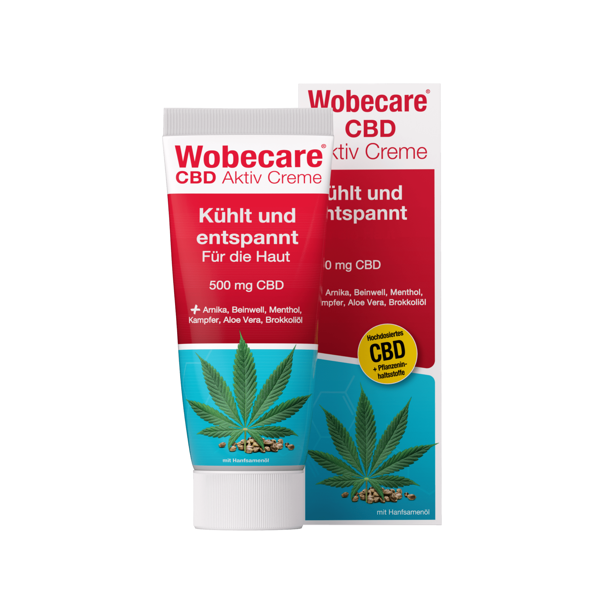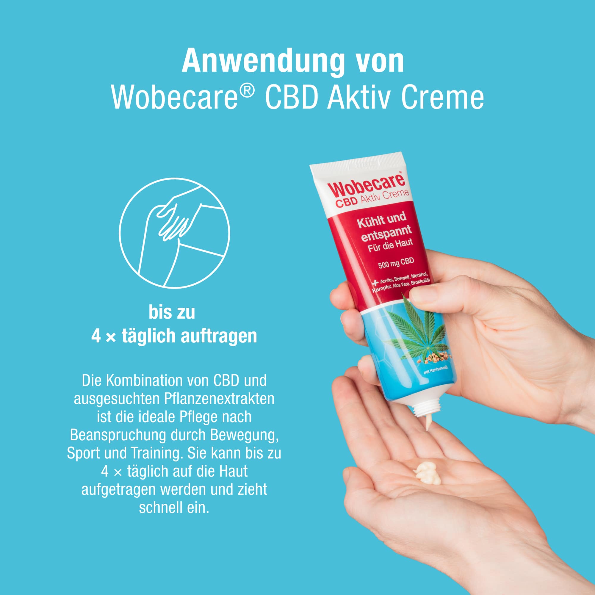 Kosmetikum mit Arnika, Beinwell, Menthol, Kampfer und hochdosiertem Cannabidiolsorgt die Wobecare® CBD Aktiv Creme für schnelles Wohlempfinden der Haut.