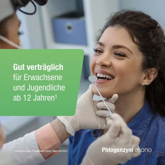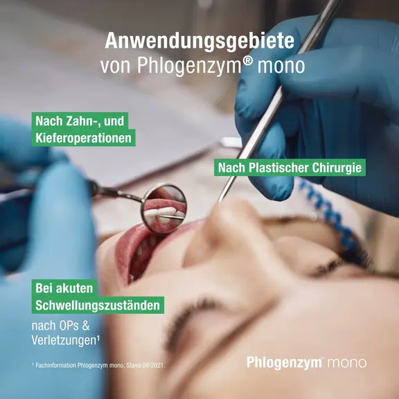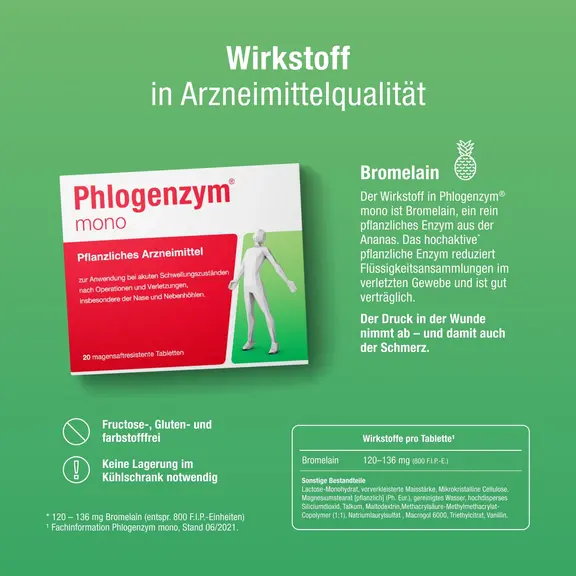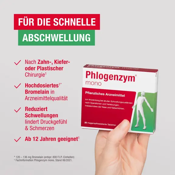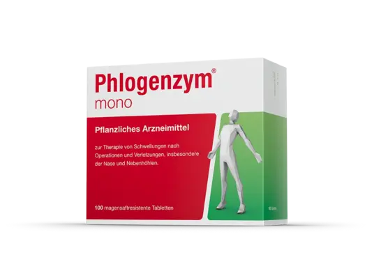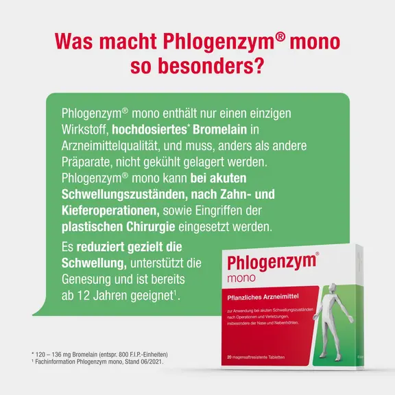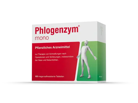 Phlogenzym® mono unterstützt den natürlichen Heilungsprozess des Körpers. Wirkstoff ist das Enzym Bromelain, welches ein Abschwellen beschleunigen und dadurch Schmerzen nach Operationen, Verletzungen und Zahn-OPs lindern kann.