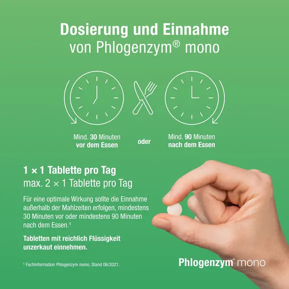 Erwachsene und Jugendliche ab 12 Jahren nehmen in der Regel 1 - 2mal täglich 1 magensaftresistente Tablette Phlogenzym® mono.