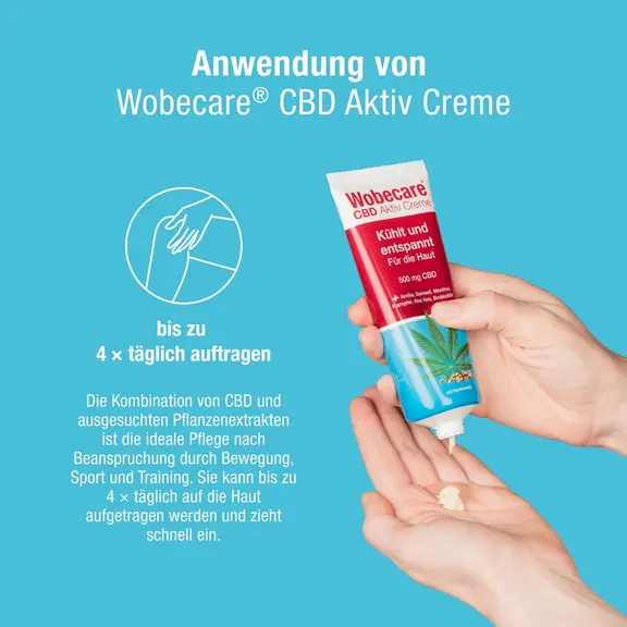 Die Wobecare® CBD Aktiv Creme ist dermatologisch mit „sehr gut“ getestet und vegan zertifiziert. Sie kann bis zu viermal täglich direkt auf die Haut aufgetragen werden. Die Wobecare® CBD Aktiv Creme zieht schnell ein und fettet nicht. Es gibt keine Beschränkung beider Verwendungsdauer.