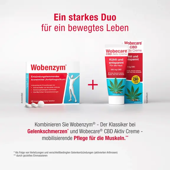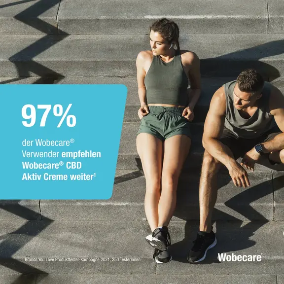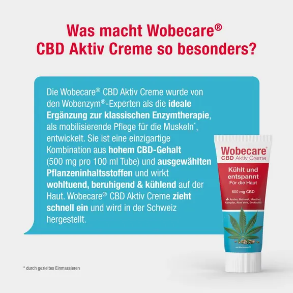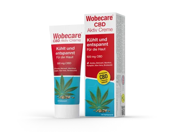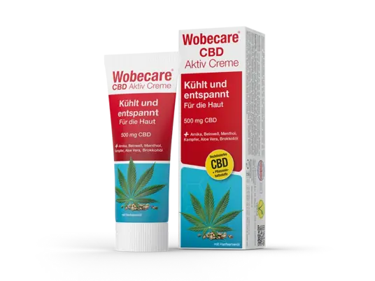 Mit Arnika, Beinwell, Menthol, Kampfer und hochdosiertem Cannabidiol sorgt die Wobecare® CBD Aktiv Creme für schnelles Wohlempfinden der Haut.