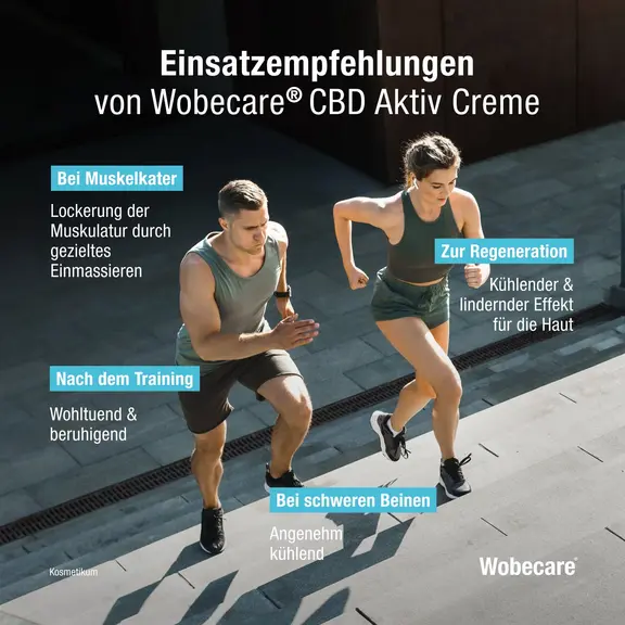 Kosmetikum mit Arnika, Beinwell, Menthol, Kampfer und hochdosiertem Cannabidiolsorgt die Wobecare® CBD Aktiv Creme für schnelles Wohlempfinden der Haut.