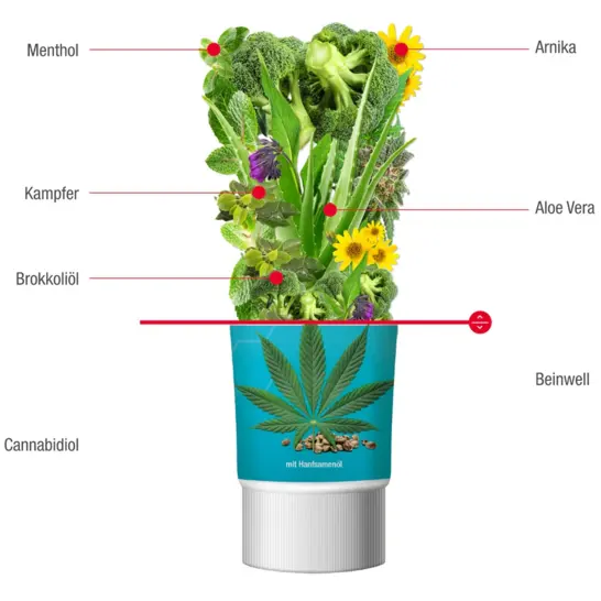 Inhaltsstoffe: Aloe Barbadensis Leaf Juice, Alcohol Denat. (SD Alcohol 38-B), Isoamyl Laurate, Glycerin, Aqua (Water), Menthol, Cannabis Sativa Seed Oil, Menthyl Lactate, Brassica Oleracea Italica (Broccoli) Seed Oil, Cannabidiol, Arnica Montana Flower Extract, Mentha Piperita (Peppermint) Oil, Camphor, Carbomer, Cetearyl Alcohol, Glyceryl Stearate Citrate, Pinus Sylvestris Leaf Oil, Alcohol, Caramel, Sodium Hydroxide, Tocopherol, Sodium Stearoyl Glutamate, Limonene, Glyceryl Caprylate, Sodium Phytate, Xanthan Gum, Helianthus Annuus (Sunflower) Seed Oil, Gaultheria Procumbens (Wintergreen) Leaf Oil, Symphytum Officinale Root Extract, Linalool.