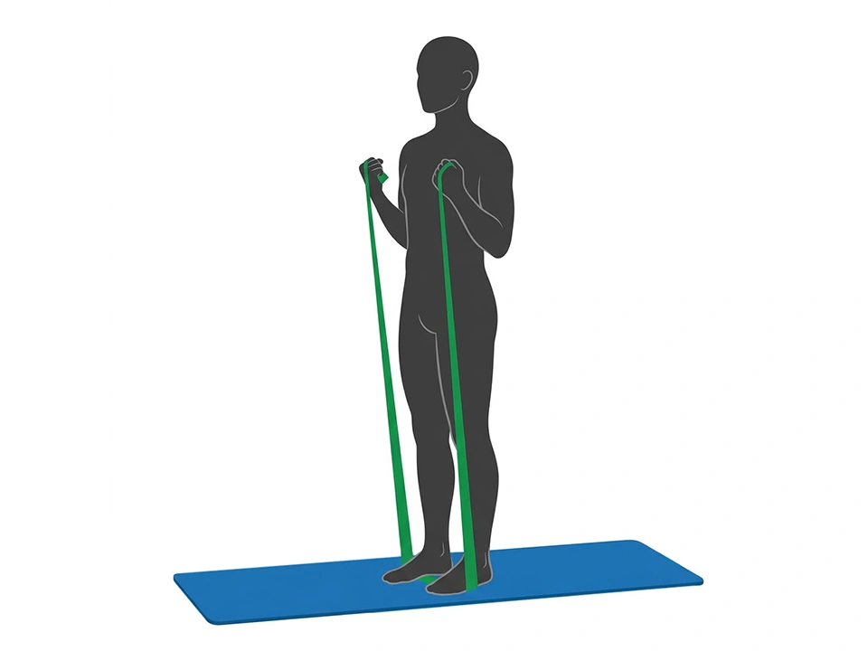 Stellen Sie sich mit den Füßen auf das Theraband® und umfassen Sie die beiden Enden des Bandes so, dass es bei angewinkelten Armen leicht gespannt ist. Ziehen Sie nun beide Hände parallel gegen den Widerstand des Bandes in Richtung Schulter. Die Ellbogen bleiben am Körper. Achten Sie beim Abwärtsbewegen darauf, die Geschwindigkeit abzubremsen. Wiederholen Sie die Übung mehrmals.