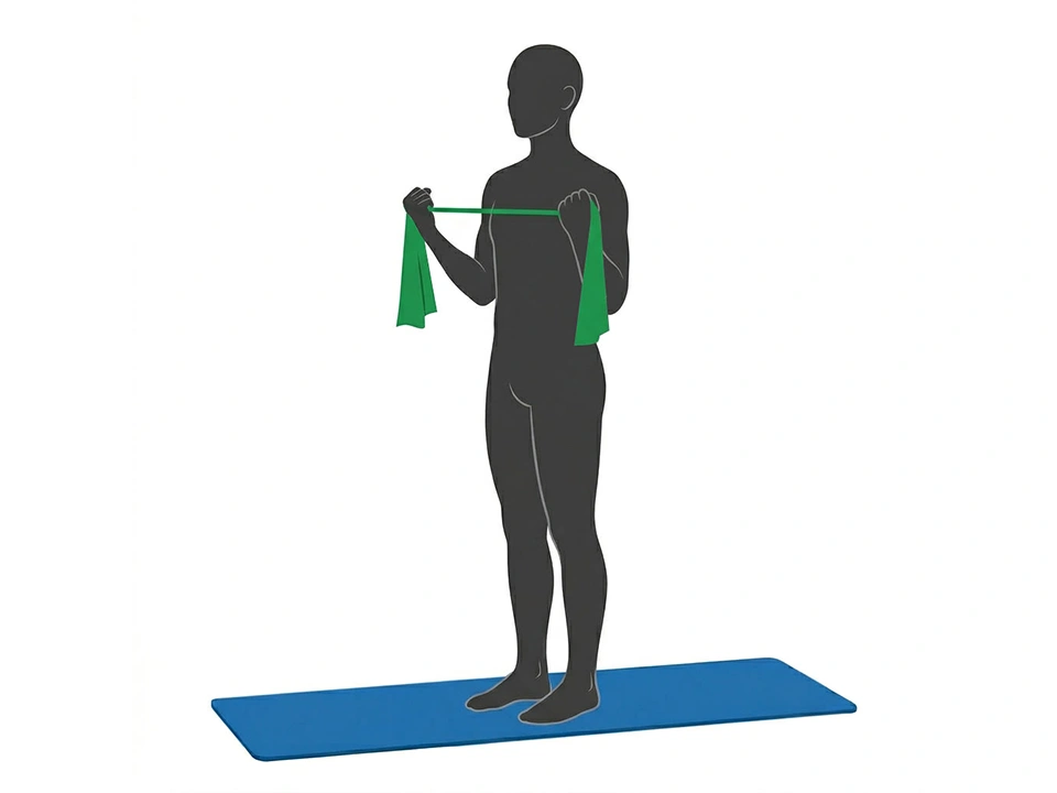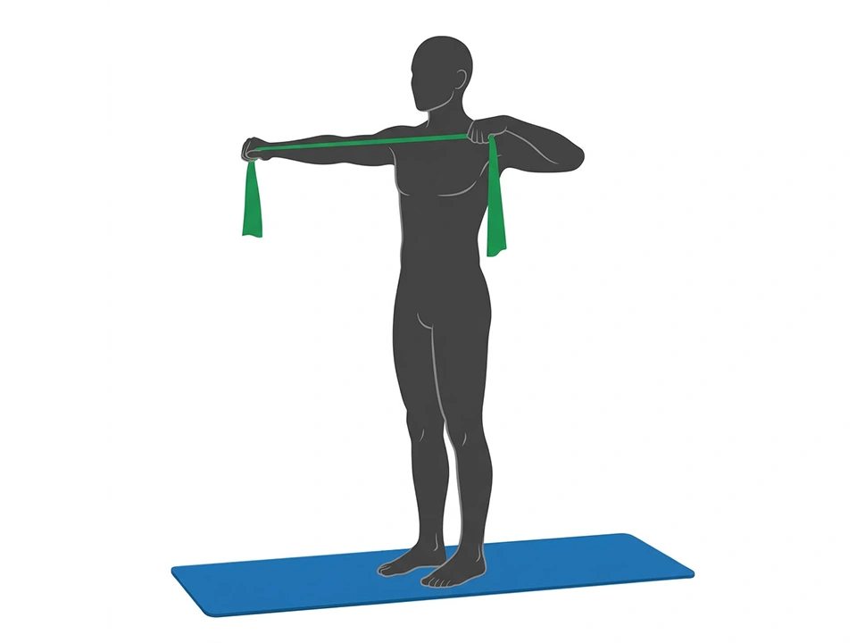 Stellen Sie sich aufrecht hin und greifen das Band vor dem Oberkörper, die Arme sind körperbreit geöffnet. Führen Sie die Arme gegen den Widerstand des Bandes nach außen und langsam wieder zurück. Ziehen Sie dabei die Schulterblätter zusammen. Die Schultern bleiben entspannt. Wiederholen Sie die Übung mehrmals.