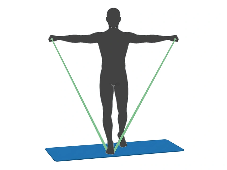 Machen Sie einen Ausfallschritt und stellen den vorderen Fuß auf das Theraband®, die Ellbogen sind dabei leicht gebeugt. Heben Sie anschließend die Arme seitlich bis auf Schulterhöhe an – ohne die Schultern hochzuziehen. Halten Sie die Spannung einige Sekunden und führen die Arme konzentriert wieder in die Ausgangsposition. Übung wiederholen.