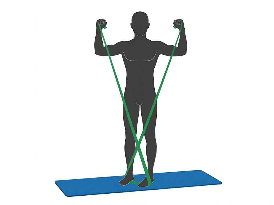 Stellen Sie sich mit hüftweit geöffneten Beinen hin, fixieren das Theraband® unter denFüßen und neigen den Oberkörper leicht nach vorne. Umfassen Sie das Band gekreuzt und halten es zunächst vor dem Körper, die Ellbogen sind leicht gebeugt und zeigen nach außen.Der Blick ist auf den Boden gerichtet. Ziehen Sie die Arme langsam nach oben, spannen Sie gleichzeitig die Gesäß-, Bauch- und Rückenmuskeln an. Die Schultern ziehen nach unten und der Kopf bleibt gerade. Wiederholen Sie die Übung einige Male.