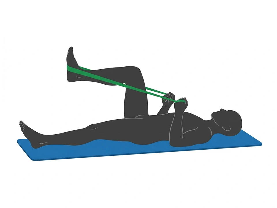 Legen Sie sich auf den Rücken, strecken das eine Bein lang am Boden aus und winkeln das andere an. Bilden Sie mit dem Theraband® eine Schlaufe und stellenden angewinkelten Fuß hinein. Drücken Sie nun das angehobene Bein vom Körper weg und halten mit den Händen dagegen. Achten Sie auf die Balance: Mit dem Knie nicht zur Seite ausweichen. Einige Male wiederholen, dann die Seite wechseln.