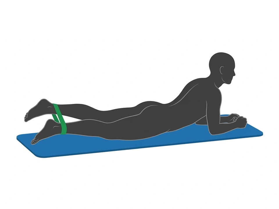 Begeben Sie sich in Bauchlage und knoten das Theraband® zu einer Schlaufe zusammen. Legen Sie das Band so um die Knöchel, dass es bei hüftbreit geöffneten Beinen leicht spannt. Öffnen Sie nun mehrmals gegen den Widerstand des Bandes die Beine. Vorsicht: Schließen Sie die Beine kontrolliert und langsam und beginnen Sie von vorne.