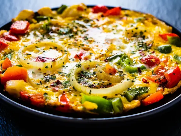 - Gebt nun das angebratene Gemüse und den geriebenen Percorino hinzu. Klappt das Omelett anschließend von beiden Seiten des Pfannenrands zusammen, um die Füllung sanft einzuschließen. Schließlich richtet Ihr das Omelett auf einem Teller an und dekoriert es mit den Lauchkringeln.