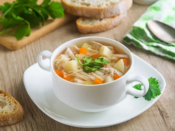 - Das Fleisch und das Gemüse aus dem Sieb gebt Ihr nun zurück in die Brühe und rundet alles mit Salz und Pfeffer ab. Serviert wird die Hühnersuppe dann mit Suppennudeln oder Reis.