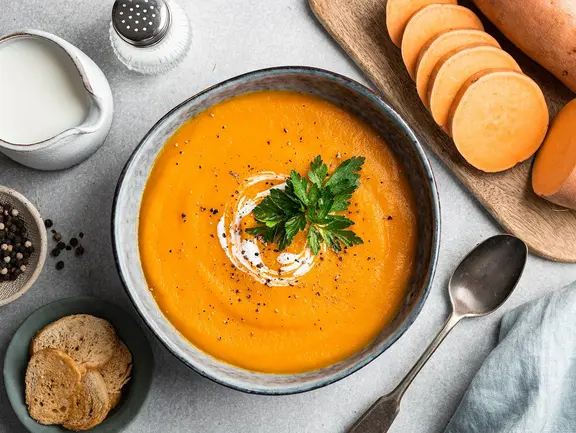 - Lasst alles bei mittlerer Hitze 20 Minuten köcheln. Nehmt den Topf vom Herd und püriert die Suppe mit einem Stabmixer fein.
